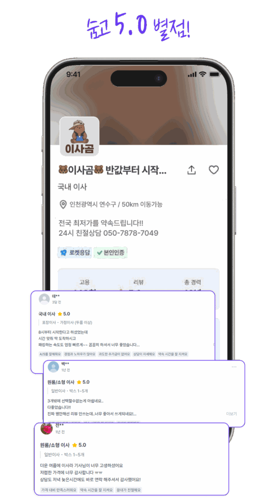 2025년 8월 6일 기준 현재까지 108,070건 이사접수가 들어왔습니다 카톡상담이 제일 빠릅니다!! 24시 🚨 특가이사 마감까지 🚨 남은 수량 00 개 00 : 00 : 00 카톡상담이 제일빠릅니다!! 24시 CLICK 소형이사 원룸, 투룸, 오피스텔 등 비용은 알뜰하게, 이사는 가볍게 자세히보기 가정이사 아파트, 빌라, 주택 등 가족단위 내 집처럼 꼼꼼한 포장과 정리 자세히보기 사무실이사 회사, 사무실, 매장, 호텔 등 이사 후 바로 일할 수 있게 자세히보기 입주청소 보이지 않는 구석까지 빈틈없이 입주 전 믿을 수 있는 전문가 청소 자세히보기 🚨 특가이사 마감까지 🚨 남은 수량 00 개 00 : 00 : 00 인증된 플랫폼에서 이사곰은 드리겠습니다! 클릭 한 번이면 이삿날 준비 완료! 이사곰과 함께라면견적부터 정리까지 한 번에 해결됩니다. 최저가 견적신청 24시 전화상담 최저가 견적신청 24시 전화상담 전화 상담 카톡 상담