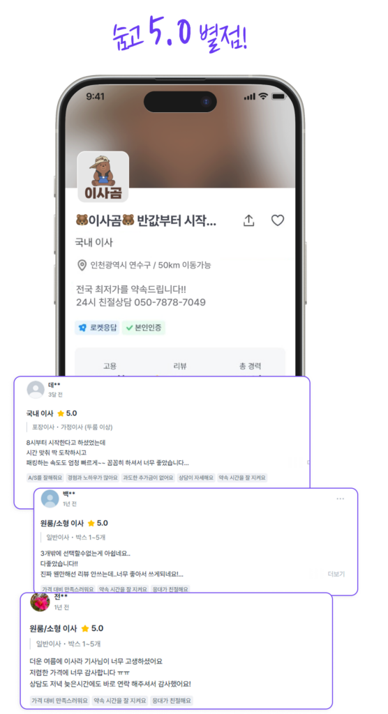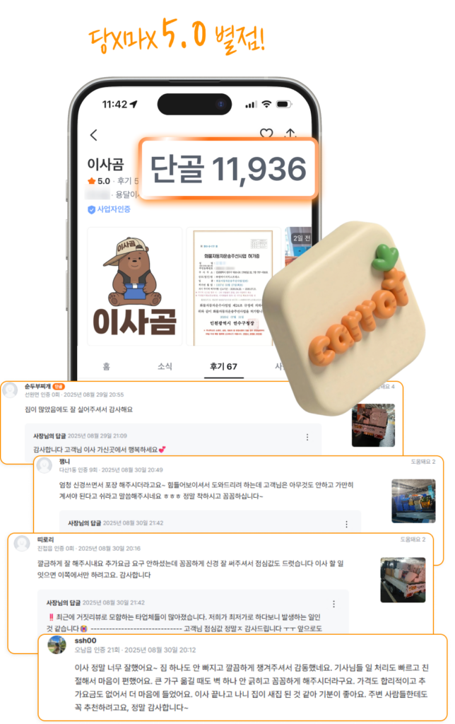 2025년 8월 6일 기준 현재까지 113,474건 이사접수가 들어왔습니다 카톡상담이 제일 빠릅니다!! 24시 🚨 특가이사 마감까지 🚨 남은 수량 00 개 00 : 00 : 00 카톡상담이 제일빠릅니다!! 24시 CLICK 소형이사 원룸, 투룸, 오피스텔 등 비용은 알뜰하게, 이사는 가볍게 자세히보기 가정이사 아파트, 빌라, 주택 등 가족단위 내 집처럼 꼼꼼한 포장과 정리 자세히보기 사무실이사 회사, 사무실, 매장, 호텔 등 이사 후 바로 일할 수 있게 자세히보기 입주청소 보이지 않는 구석까지 빈틈없이 입주 전 믿을 수 있는 전문가 청소 자세히보기 🚨 특가이사 마감까지 🚨 남은 수량 00 개 00 : 00 : 00 인증된 플랫폼에서 이사곰은 드리겠습니다! 클릭 한 번이면 이삿날 준비 완료! 이사곰과 함께라면견적부터 정리까지 한 번에 해결됩니다. 최저가 견적신청 24시 전화상담 최저가 견적신청 24시 전화상담 전화 상담 카톡 상담 여기를 클릭하세요